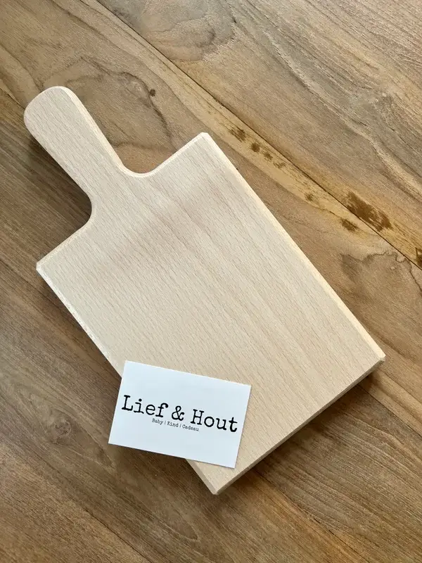De plank is 19x15cm (inclusief handvat 28cm) en onbehandeld beuken hout.